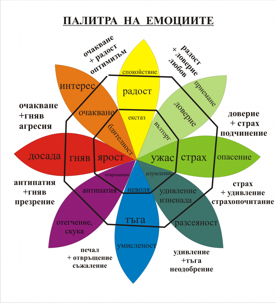 Робърт Плутчик предлага описания вече триизмерен модел, който описва отношенията между емоциите. Този модел е подобен на цветно колело. Вертикалното измерение представлява интензивност (в центъра на колелото са емоциите с най-голяма интензивност, а в периферията с най-ниска), а кръгът представлява степента на сходство между емоциите. Според него има осем първични (основни) емоции, подредени като четири двойки противоположности. Споровете са симптомите, а не проблемите във всяка една връзка! Човек със сигурност преживява по време на живота си цялата описана вече палитра от чувства и емоции. Някои други изследователи твърдят че съществуват мета-емоции, които са всъщност емоции за емоциите - което също е вярно, тъй като човек изпитва базова необходимост да се стреми към щастие, радост и да избягва по възможност болката и неприятните усещания.