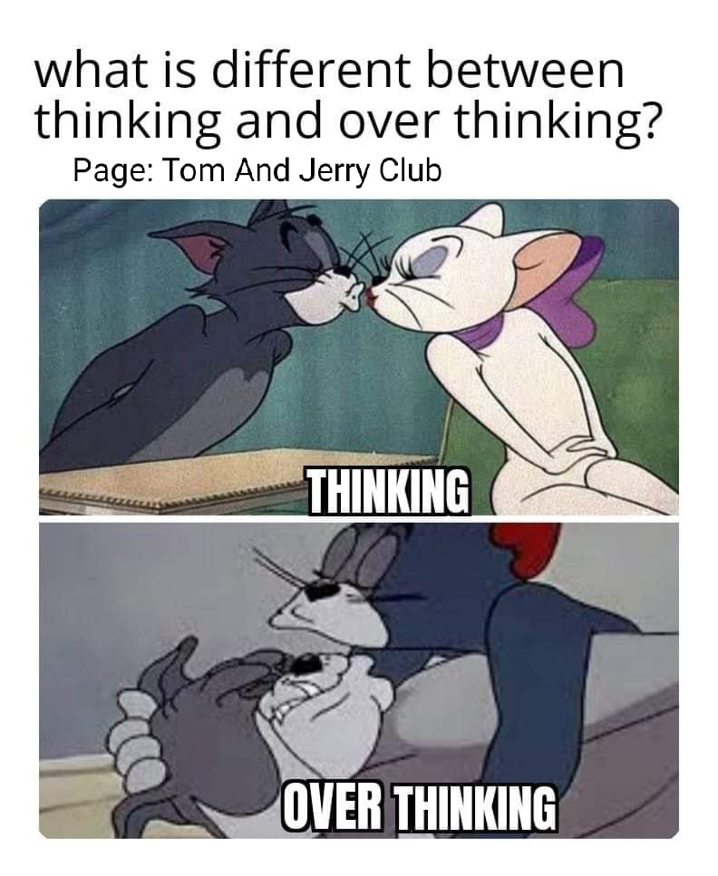 Понякога дори и в детските анимационни филмчета се отправят доста смислени философски послания - както например в горната картинка, която нагледно обяснява разликата межу мисленето и прекалено многото мислене (overthinking). Когато мисълта за поставянето и постигането на нови цели ни действа жизнеутвърждаващо, тогава всички е наред - индивидът има силна мотивация и е упорит и последователен.